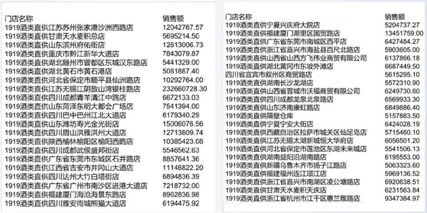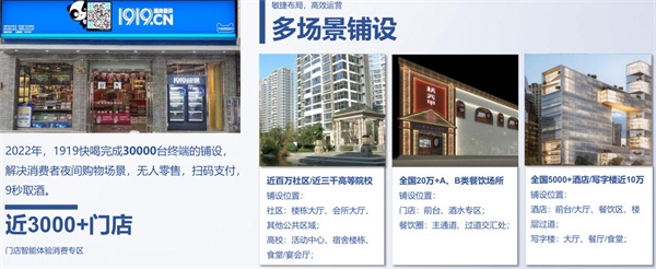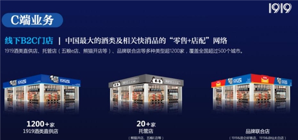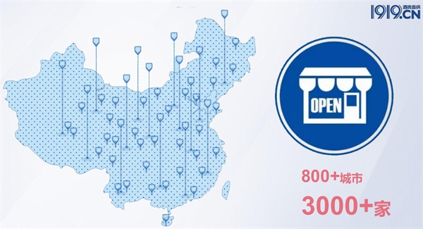 已在全国所有省级行政区、600多个城市拥有1200多家直营管理的线下体验店;1919的O2O平台是仅次于天猫、京东后的第三大酒类开放平台。众多国内外知名品牌如茅台、五粮液、泸州老窖、奔富等700多个品牌强势入驻;2015年11月,1919宣布与购酒网战略合并。在2015天猫“双11”酒类销售中,1919和购酒网销售额分别为1.57亿和0.55亿,分别排名第一与第三,整体排名第一。1919的O2O平台线上线下一体开放,线上订单全部分配给门店,收益归门店独享。