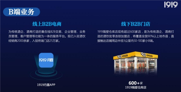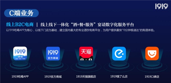 壹玖壹玖酒类平台科技股份有限公司,简称1919,是专业的酒类电商平台,是国内酒类流通行业第一家公众公司(股票代码:830993),也是面向全球发展的酒类连锁企业。2018年,1919获得阿里巴巴20亿元战略投资,成为酒饮新零售业内独角兽。加入阿里生态圈以后,1919的线上线下更加深度融合,致力于打造酒类及相关快消品的“零售+店配”网络,线上以1919吃喝APP为核心,为用户带来更为丰富的订酒+订餐+订服务服务,并依托线下500个城市的1991家门店,为用户提供最快“19分钟极速达“的购酒体验。