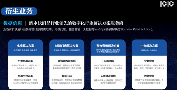 1919已形成C端业务、B端业务、衍生业务三大板块,实现了从销售型公司向平台型公司的进化。并持续以开放的心态,深化“平台+老板“合伙人机制,不断推动品牌创新、科技创新,产品创新,构建酒饮及大快消行业的产业互联网蓝图。