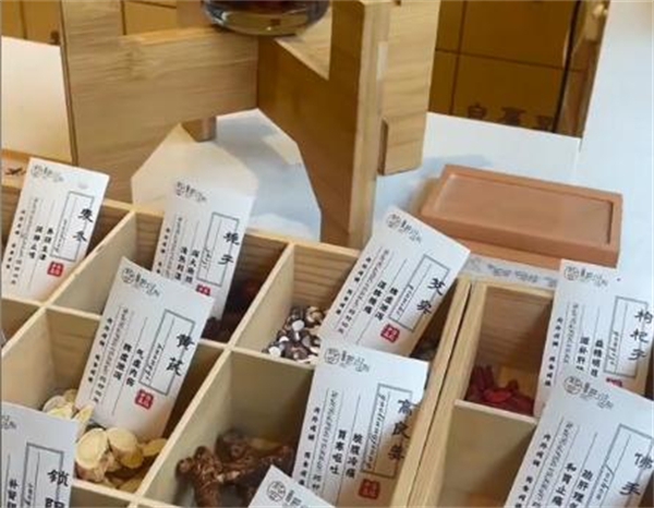 店铺内部装潢以药材为主体,营造出浓厚的中式茶饮文化氛围,为顾客提供独特的消费体验。