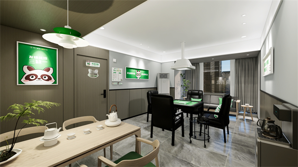 所有的四个朋友自助棋牌室都保持统一的装修风格。在加盟商进行店铺装修时总部会派专业人员进行现场设计,会设计出最合理的装修方案。