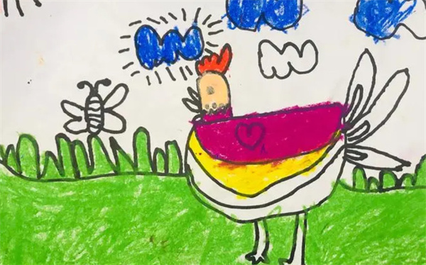 儿童绘画约束少、定式少,思维大胆、动作开放、画面给人一种强烈的夸张性。看起来真是“胆大妄为、异想天开”。儿童在绘画时表现的夸张与感受特点和注意力有关。他们往往把注意力集中在最感兴趣的形象上。在绘画时,有兴趣的形象和部位表现较大,相对具体,有夸张倾向。其它形象相对简单、概括。在色彩方面,一般是主观意向色彩和个人偏爱的色彩。特点是色彩强烈、明确。