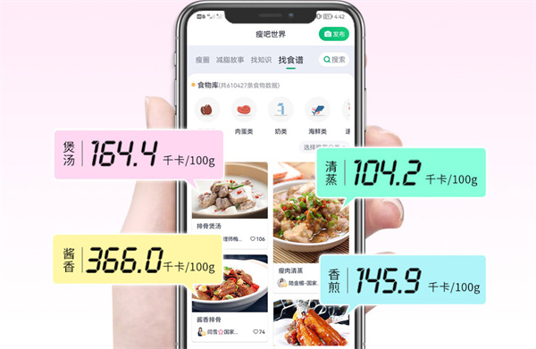 5.发现页面:瘦吧减肥拥有减脂知识库,在减脂的同时可以收获减脂知识,并有海量食物库,详细展示食物的营养元素和热量。