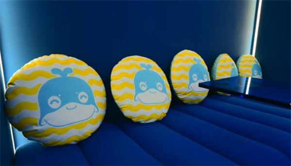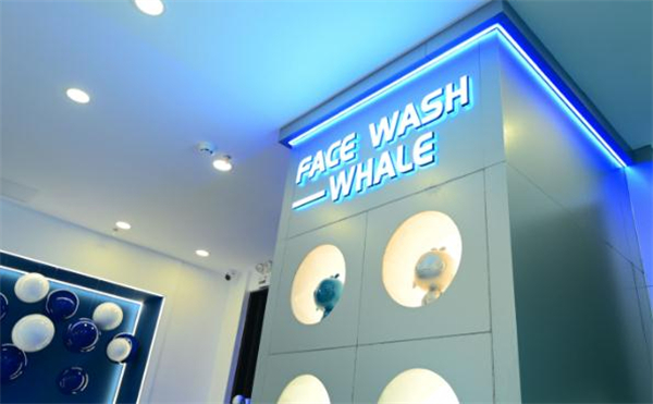 海洋蓝的门头,加上银灰色的小鲸鱼vi设计,立体模型洗脸鲸的形象看起来更生动。
