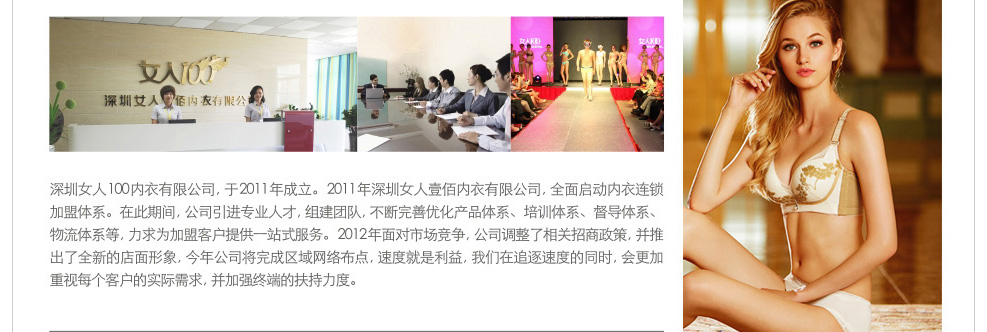女人100始终坚持统一品牌,统一价格,统一形象,统一管理的模式,逐步形成集品牌整合与推广﹑零售﹑代理﹑连锁加盟为一体的经营和管理体系。销售业绩连年攀升,呈现良好的发展态势。在往后的日子里,将持续内衣的研发﹑专注市场与客户需求,专注产品的品质与人才的培养,以品牌连锁特有的营销模式走向规范化﹑现代化﹑专业化﹑多元化﹑国际化企业迈进,致力开创中国有影响力的内衣连锁品牌。