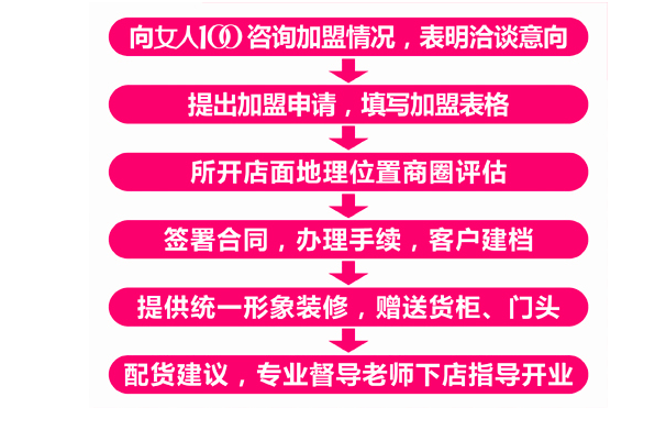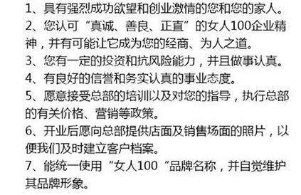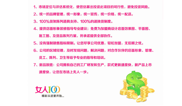 本公司坚持以品质为基础,以信誉为生命,以服务为特色,以客户的满意程度为工作的评判标准,始终站在市场前沿,女人100凭借"时尚,叛逆,颠覆,创新 的"的经营理念,打破原来多年传统的营销模式,以差异化的产品定位,优异的产品质量,时尚的产品款式,强势的价格优势,具有时尚文化多元素的装修风格,灵 活快速的市场反应,健全的售后服务,吸引更多消费者的青睐,同时打造加盟商的核心竞争力,迅速占领市场,为您创造更多的财富奇迹。