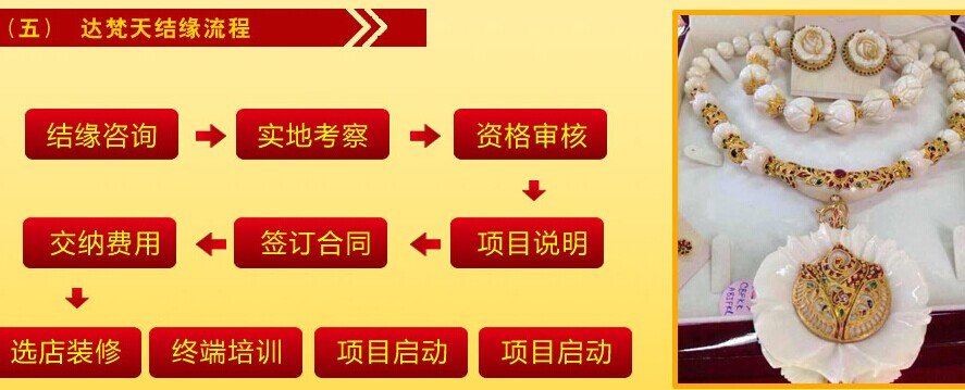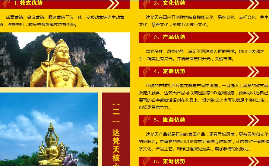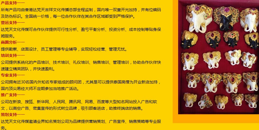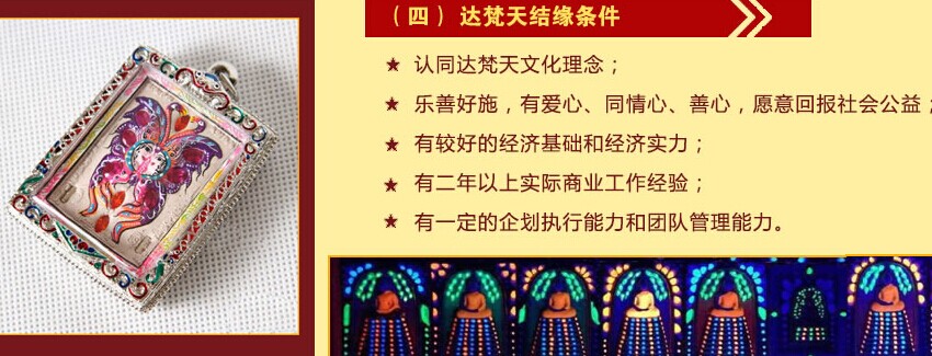 达梵天饰品顺应“文化和信仰”大的发展趋势,以加盟连锁店为主要经营模式,满足人们的信仰需求、时尚需求、美的需求,将传统文化和佛文化产品(如佛牌、佛珠、佛像、天珠等佛教圣物)、易经文化产品(如易经风水摆件等)、吉祥文化产品、养生文化(如茶道养生、香道养生等)产品完美结合,打造全新的大吉祥文化黄金产业。
