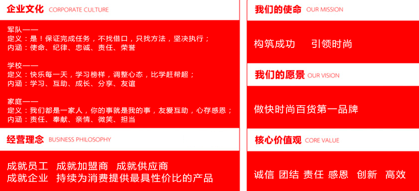 6000款的SKU,百分百全系列定制产品,保证品质, 首批货品百分百的调换货政策,让加盟商零库存