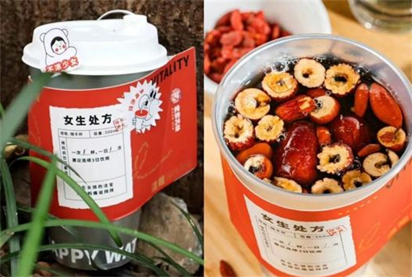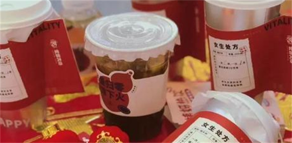 命名上倾向于直接用材料,比如姜汁红糖牛乳茶、桃胶养颜人气杯等;还有上文提到的用“红色处方单”杯套,用贴纸展现饮品功能,寓意喝下一杯姨妈热饮,必能“药到病除”。