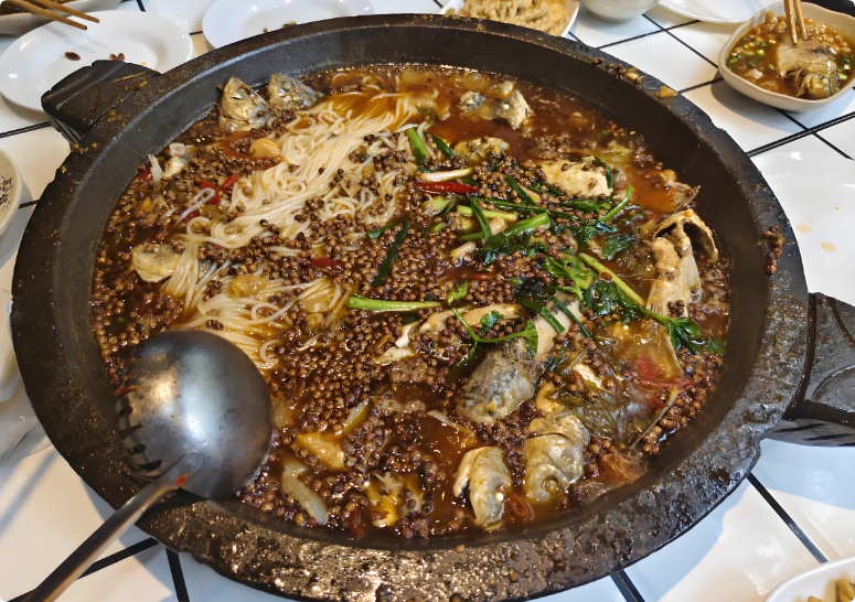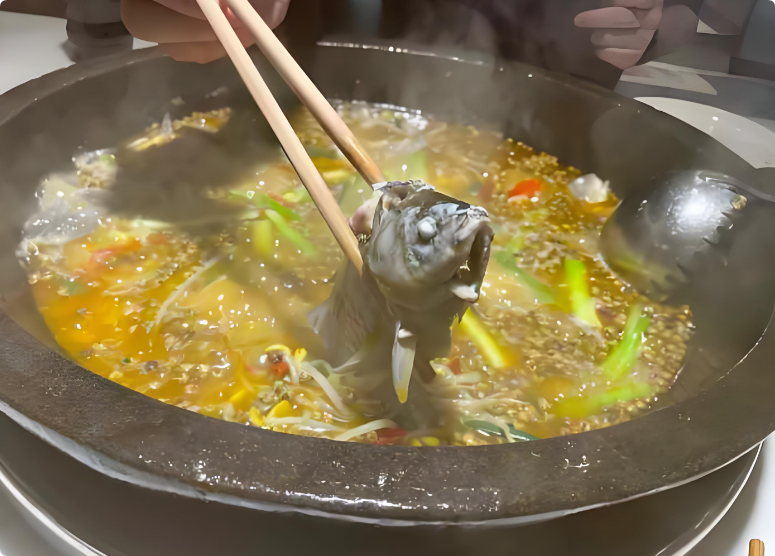 “铁言子石锅土鲫鱼“的石锅是采用唐古拉天山然原生花岗岩精雕细磨而成,选用二两左右“清水鲫鱼”配以天然香料及中药材,再加上本店传统老坛泡菜及秘制酸菜,小火慢焖而成,其味麻辣鲜香、鲜嫩滑爽、醇香汁浓,不仅味道鲜美,而且还能补充人体所需的各种矿物质及微量元素;坚持做好原生石锅养生鱼开创者!