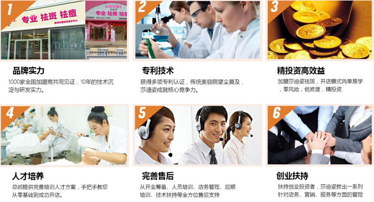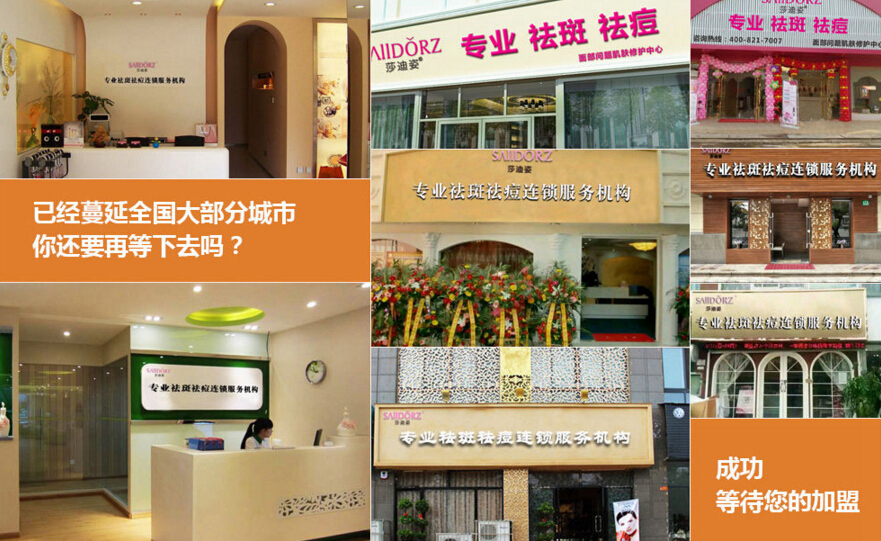专业的研发、市场营销、技术培训、售后服务的精英团队让莎迪姿在中国祛斑祛痘美容行业遥遥领先,独领风骚。公司荣获中国十大最具影响力祛痘机构证书,全国专业祛斑客户满意信赖品牌,全国皮肤护理消费者满意十佳首选品牌,全国质量.服务.信誉AAA级品牌.,全国3.15诚信品牌.中国最具投资价值连锁加盟品牌。放眼未来,莎迪姿为每位经营者提供更优质的产品,更专业的技术,跟完善的扶持体系,打造健康肌肤。你的美丽,就是我的使命!